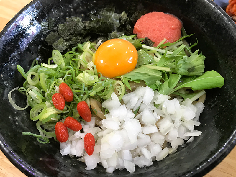 変わり種ですが、女性に人気なのが明太子クリームまぜそば。明太子と生クリームの濃厚ソースが絶品!もはやこれはパスタだよねって感じですが、タマネギや九条ネギのシャキシャキ感と黄身のまろやかさは非常にマッチしています。明太子パスタとカルボナーラのいいとこ取りって感じですね!これもオススメです!