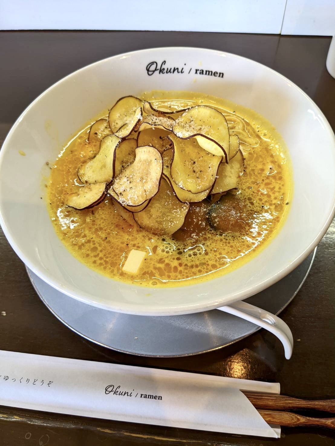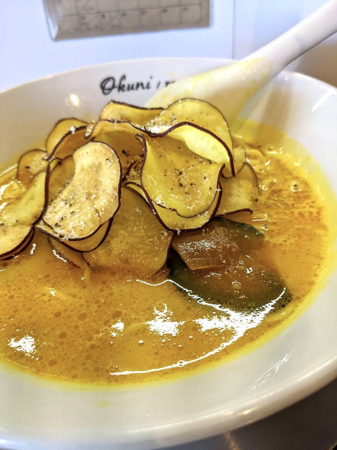 黄金色に輝くかぼちゃのスープは、サラサラとした口当たりであっさりとした味わい。かぼちゃのスープと聞くと濃厚でクリーミーなポタージュ系を想像しがちですが、「おくに/らーめん」のそれは、上品なかぼちゃの甘さが引き立つ味わいで、サラリとした口当たりで、ラーメンにめちゃくちゃ合います!スープには細かく刻んだチーズが入っていて、味のアクセントとして活きていて良い!トッピングには、もう一つの主役。パリパリ食感のさつまいもチップスがたっぷりと乗り、仕上げに粉チーズが美しく散らしてあります。