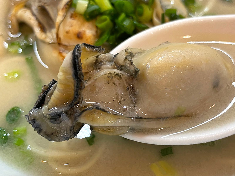 トッピングの牡蠣は通常で4粒。+200円で1粒、+300円で2粒追加トッピングできます。表面を炙ってあるので、こんがりと香ばしく、食感はプリップリでめちゃくちゃ美味しい!