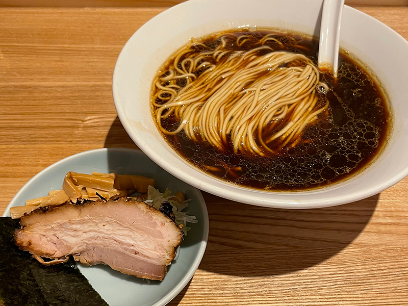 黒い醤油ラーメン、ABE’s Black。10年寝かせた十歳造(ととせづくり)という高級な醤油をタレに使用したラーメンとのこと。チャーシュー、メンマ、ネギ、海苔のトッピングは別皿で提供されます。目が覚めるほどキリッとしたスープは、鶏の風味と重なってめちゃくちゃうまい!こんなうまい醤油ラーメンはなかなかないです!