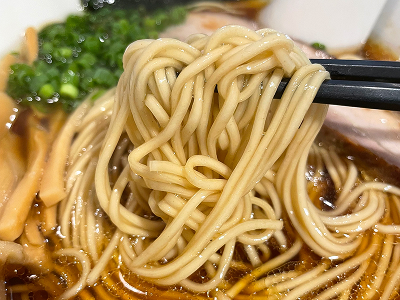 透き通った美しいスープ。一口いただくと、まずニボシの苦味が感じられて、ニボシ好きはニンマリしてしまう美味しさ!素材の味がしっかりと引き出されたダシに思わず唸ってしまい、麺にいくのを先延ばしにし、二口、三口と味わいたくなるスープです。