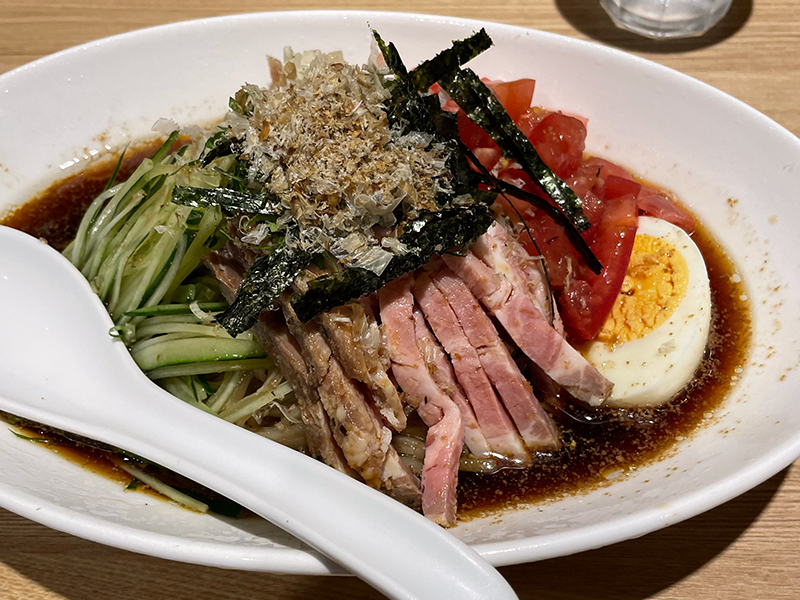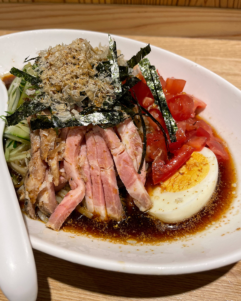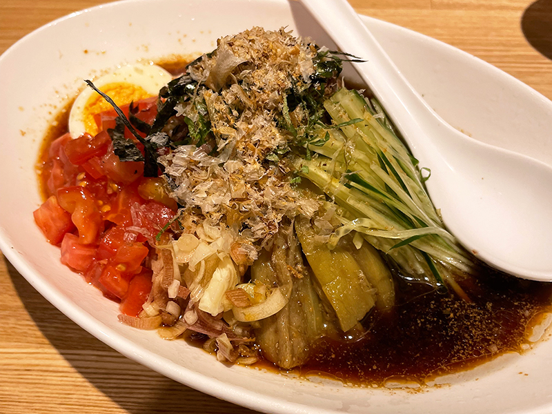 毎年夏限定で提供されるABE’Sの和風冷やし中華。ナス、トマト、きゅうり、大葉、ミョウガなどの夏野菜がトッピングされていて、季節を感じられる一品です。延命酢の酸味が効いた、まろやかで鰹の旨味が広がるタレが、全体をまとめてくれています。