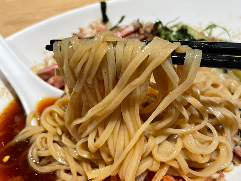 Abe’s自家製の麺も最高にうまいです!中華そばの麺は細くてやや平打ちでしょうか?パツンとした歯切れのいい麺で、一本一本がしっかりと主張しています。噛みごこち、喉越しがよくて、スープとの相性も抜群です!