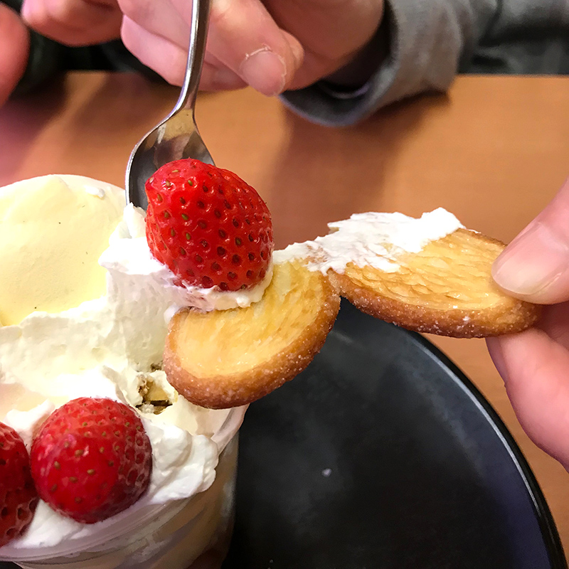 苺すぎるミルフィーユパフェを、妻と子と3人でシェアしていただきました。源氏パイは2枚がパフェの上に、2枚は袋に入って提供されるので丸のままの源氏パイは計4枚。4人くらいでシェアするのが適当ということでしょうか。