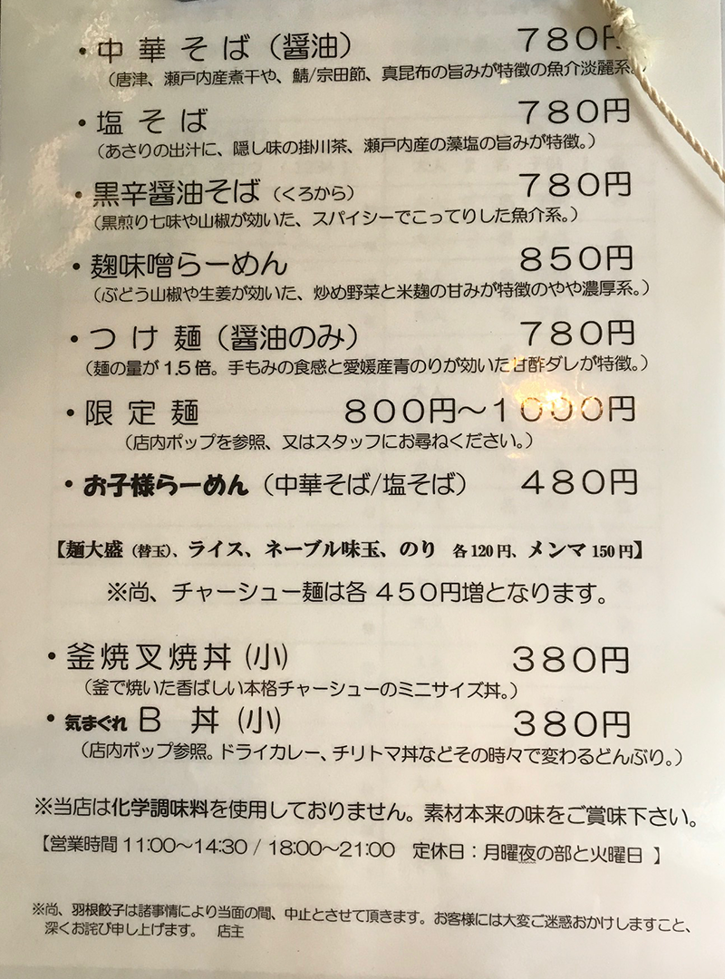 山椒が効いた黒辛そばや、ぶどう山椒や生姜が効いた麹味噌らーめんなど、個性的なメニューが並び、気になるラーメンばかりです。