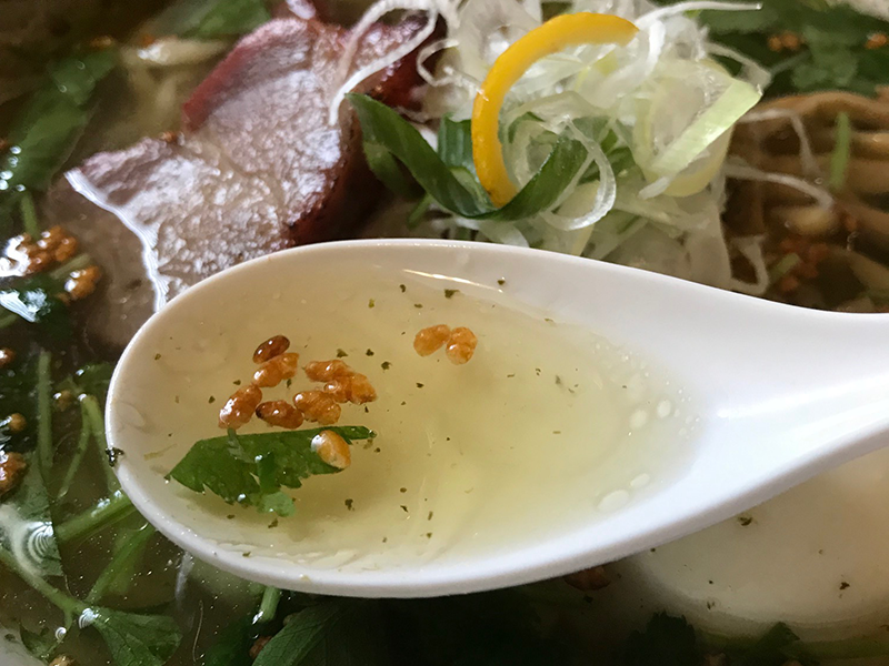 透明感のある清湯系スープに三つ葉やアラレがあしらってあり、和の趣が感じられる一杯です。この料亭感がすごい。