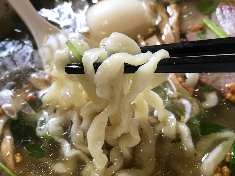自家製の手もみ平打ち麺は、かなりちぢれており個性的です。こんなビジュアルの麺は、なかなか他の店では見たことがないですね。食感もそこまでコシがあるわけでもなく、うどんのような少し柔らかめの食感で、良くも悪くもラーメンを食べている感じがしないかも。