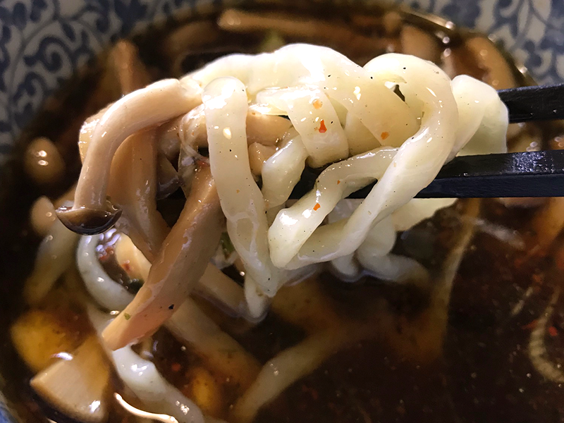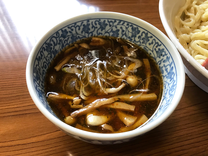 つけ汁にはきのこやメンマ、ネギが入っています。