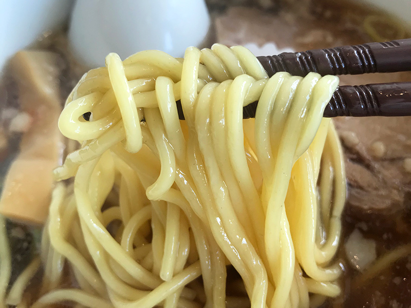 キレのある正油スープと相性バッチリな中細でやや縮れた麺。なんと断面が丸くて、パスタに近いような食感です。こんな麺のラーメンは初めてで驚きました!食べ応えがあって、美味しいですね!まぜそばや汁なし系にも良く合いそう!