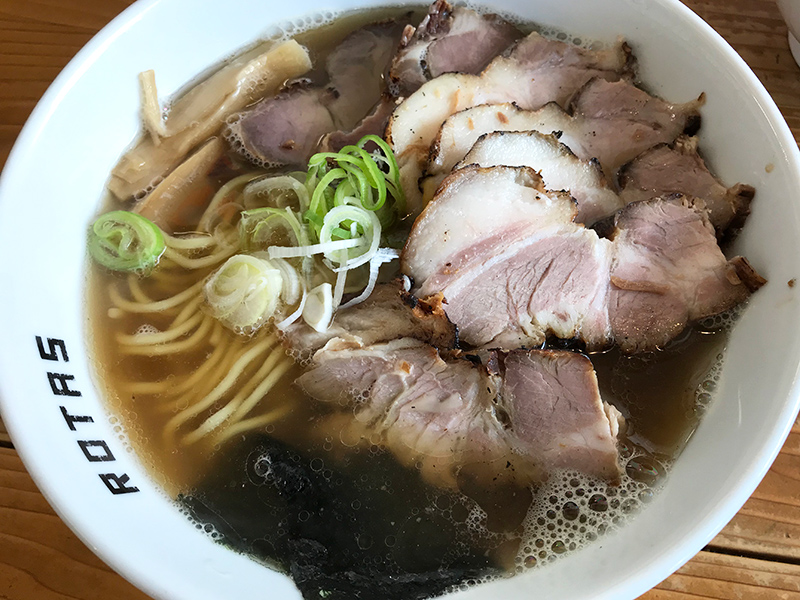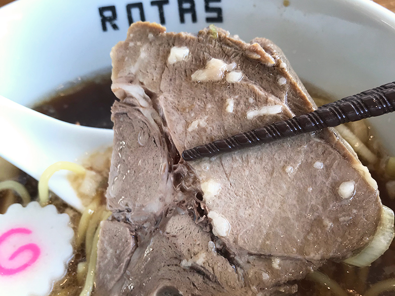 肉付きの息子がオーダーしたのは、焼き豚チャーシューがこれでもかとトッピングされた、チャーシュー煮干ラーメン。ローストトマト煮干ラーメンにもトッピングされていたこのチャーシュー、外側がしっかりグリルされていて香ばしく、プリッとした肉質で本当にうまい!ラーメン屋さんでこんなにうまい焼き豚に出会ったのは初めてかもしれません。チャーシューだけ一本テイクアウトしたいくらいうまいです!ろたすのチャーシュー最高!