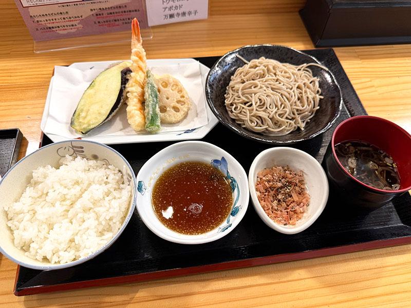 天ぷらだけじゃない。お蕎麦も美味しいおひるごはん。天ぷらと蕎麦、ごはんも付いた、えごま油のつけ蕎麦定食(1300円)を食べました。ご飯は大盛り無料です!(写真は普通盛り)