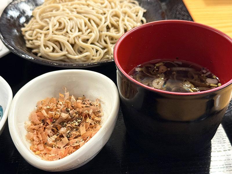 えごま油が入ったコクのあるつけ汁と、味変アイテムとして鰹節ブラックペッパーが付きます。最初はそのままつけ汁につけて蕎麦を味わい、徐々に鰹節ブラックペッパーをつけ汁に加えていってください。鰹節の風味が移ろいが感じられると思います。