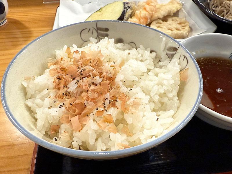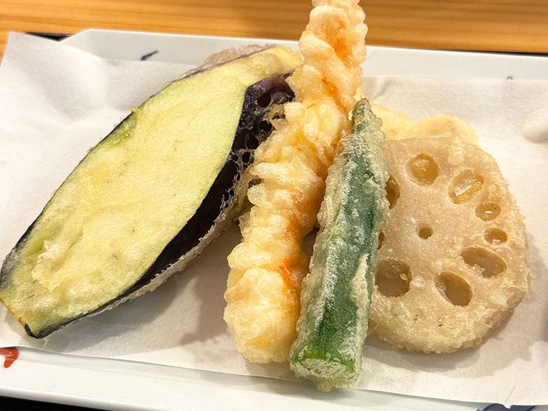 もう一つの主役天ぷらも忘れてはいけません。エビ×1、野菜×3(この日はナス、オクラ、レンコン)、そして鶏天か白身魚が1つ選べます。隠れていますが、今回は鶏天をチョイスしました。鶏天、下処理を丁寧にしているとのことで、かなり柔らかくてプリプリで美味しい!天ぷらはどれも薄衣でカラッと揚がっているので、油っこくなくさっぱり食べられます!