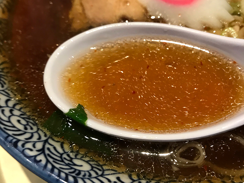 魚介を軸にしたスープに、豚の旨味と甘みが重なる重厚なスープ。スープ表面には豚の油がコーティングされていて、スープをすすればテカテカセクシーな唇に仕上がります。わずかに唐辛子も浮いていて、若干ピリリと辛味も感じるスープです。