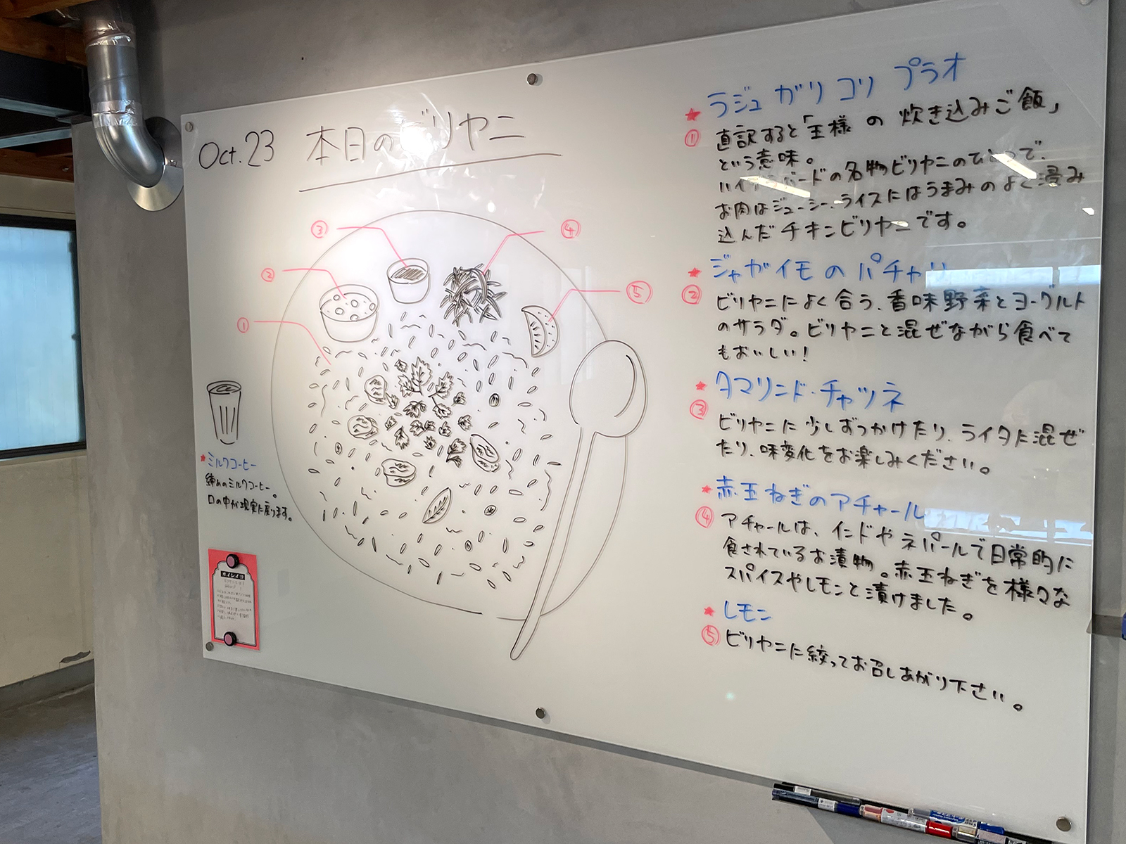 イートインスペースにはホワイトボードがあり、メニューの説明が書いてあります。何も説明がなかったら「何かよくわからんけどうまかった!」で終わるところですが、料理名やスパイス、素材の説明を見ながら食べると、より理解が深まるのでいいですよね。