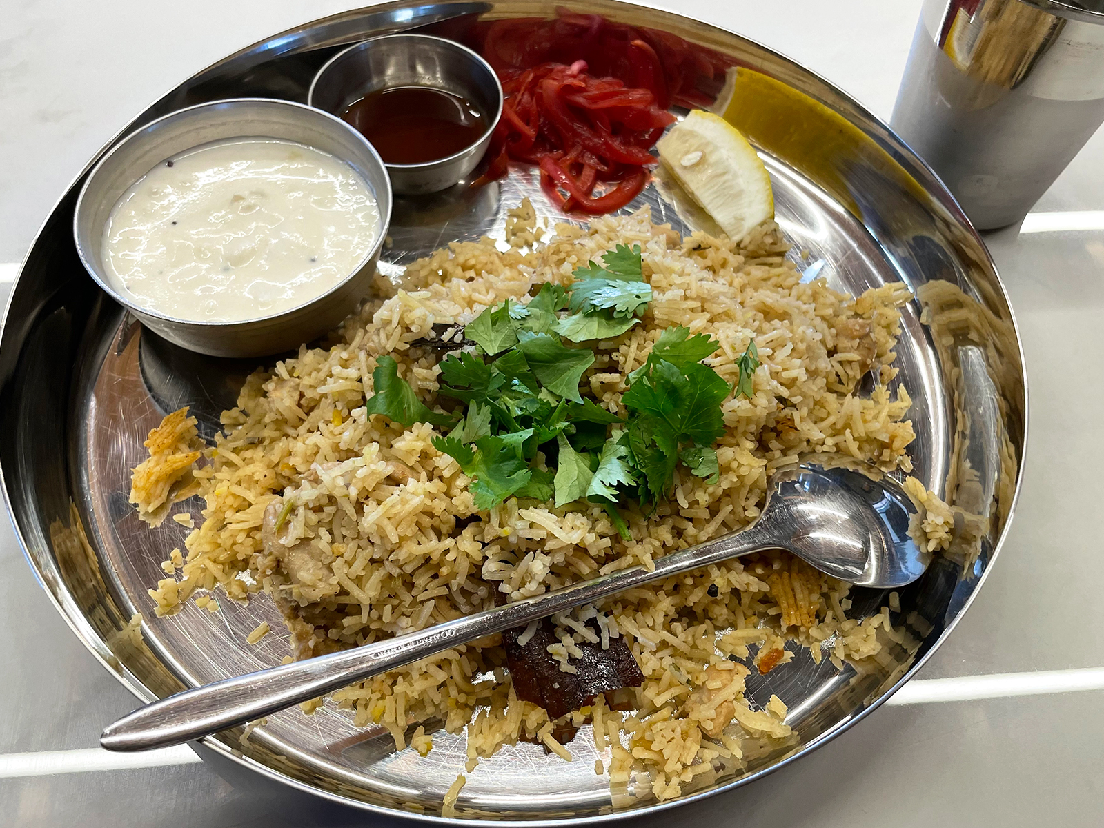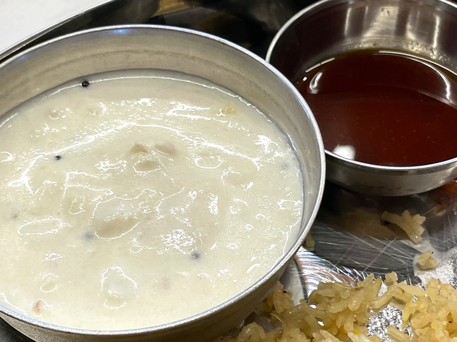 南インドのチキンビリヤニとサツマイモのパチャリ