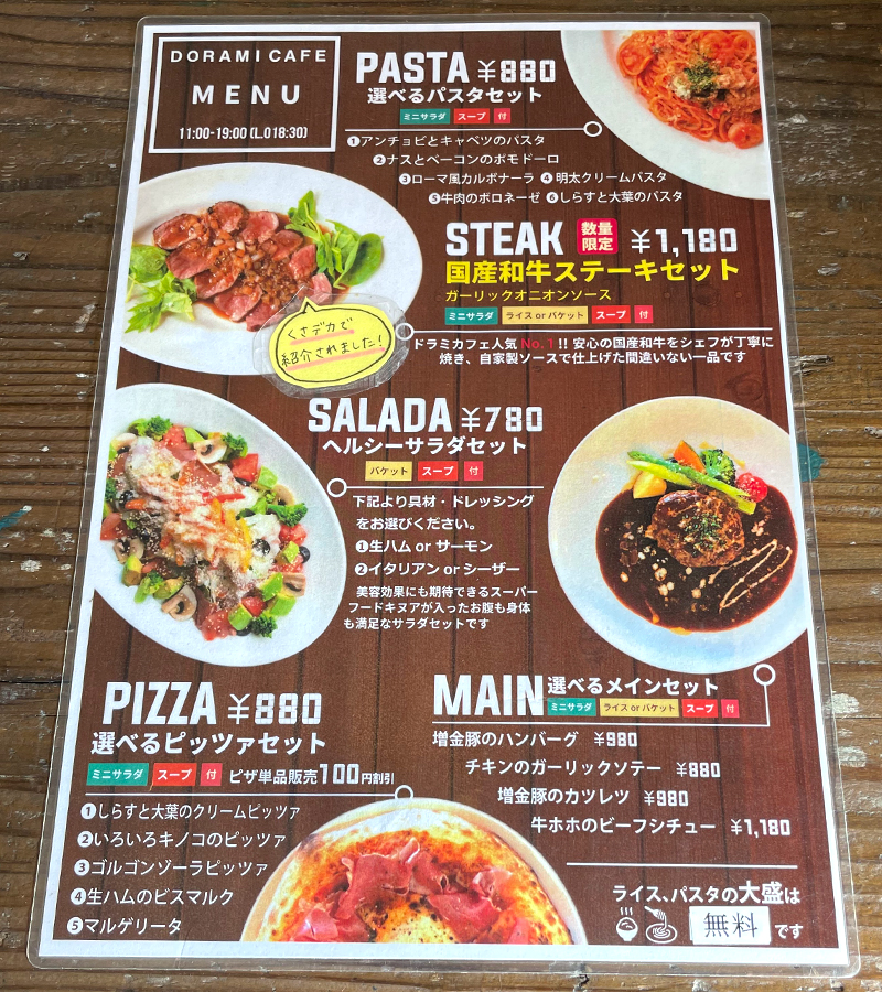 ドラミカフェのランチメニューは、パスタやピザ、和牛ステーキ、ハンバーグなど、かなり魅力的なメニューが揃っています!しかもかなりリーズナブルで嬉しいですね!化学調味料不使用とのことで、お子様連れでも安心!そして価格もとってもリーズナブルなので、本当に嬉しいお店です!