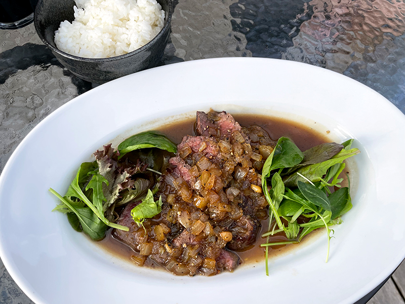 玉ねぎたっぷりのガーリックソースがかかった、国産和牛のステーキ!中はレアに仕上がっていてうまい!醤油ベースのソースとの相性が抜群で、ライスがすすみます!パン好きの方なら、ライスじゃなくてバケットも選べますよ。
