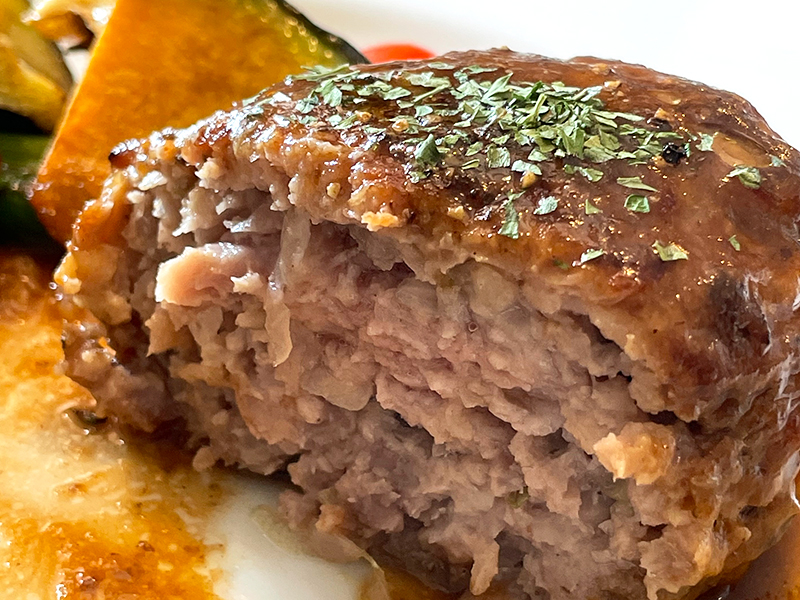 「増金豚」というブランド豚を使用したハンバーグ。食べ応えのある粗挽きタイプで、しっかりとした肉質を感じることができてうまい!付け合わせのお野菜もいい歯ごたえで美味しいですね!