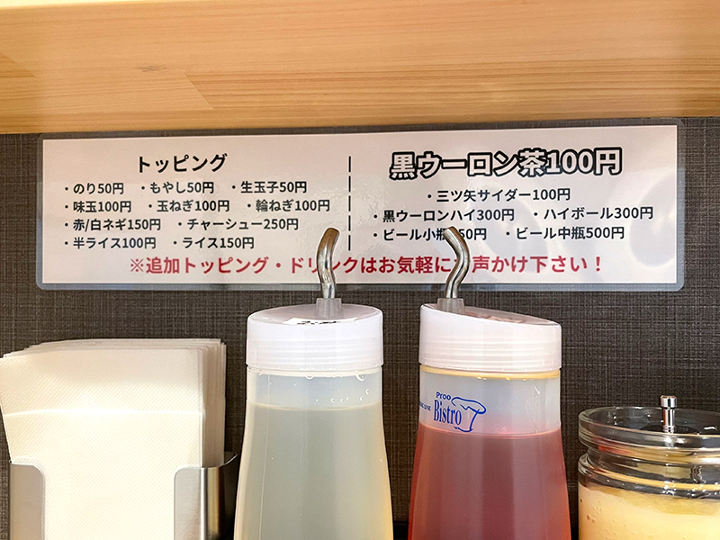 席に着いてからでも、追加のトッピング注文ができるようです。ちなみに麺を注文すると、半ライスをサービスしてもらえますよ!