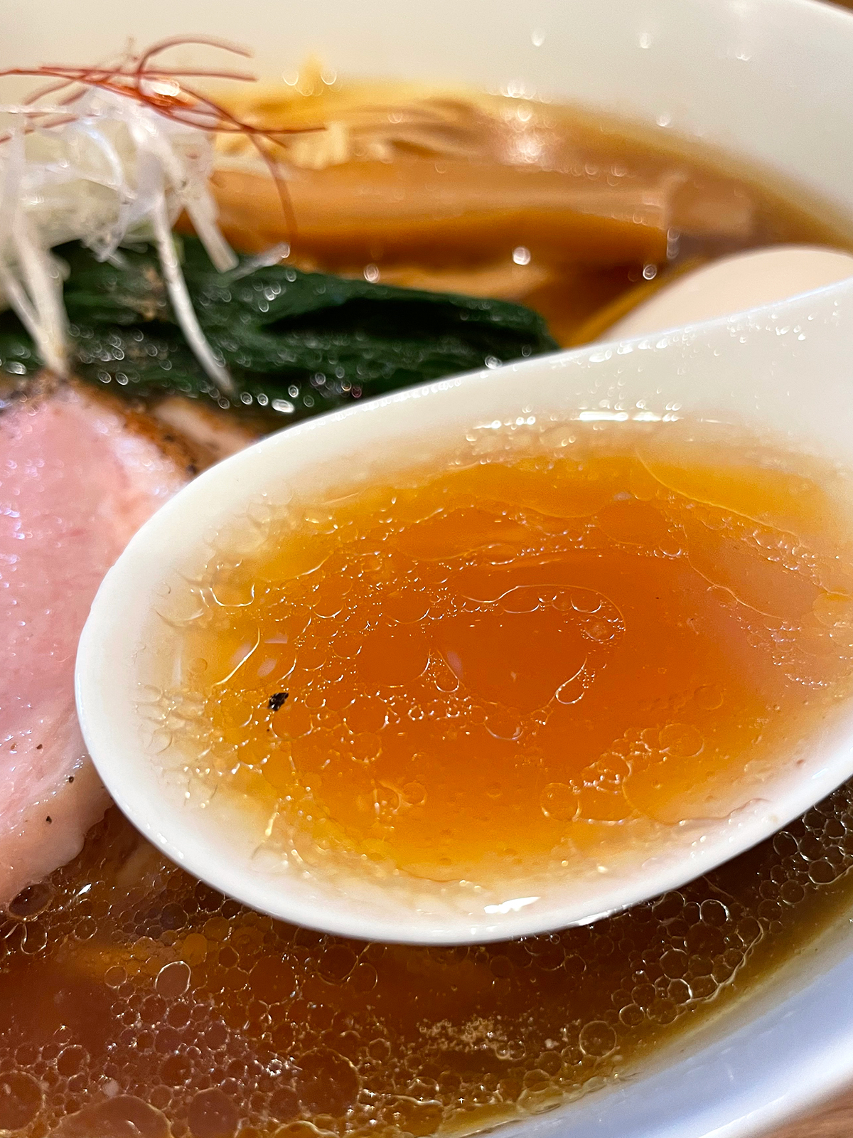 一口目に頂いたスープは、鶏の香りが先行しましたが、後半になるにつれ…おぉ!キタキタ!貝出汁だ!ってな具合に貝の味わいが後から追いかけてきます。しじみとかあさりの喉の奥にグッとくる味わいというよりかは、ホタテ系のようなふんわり優しい貝の甘み!さすがの旨さです!