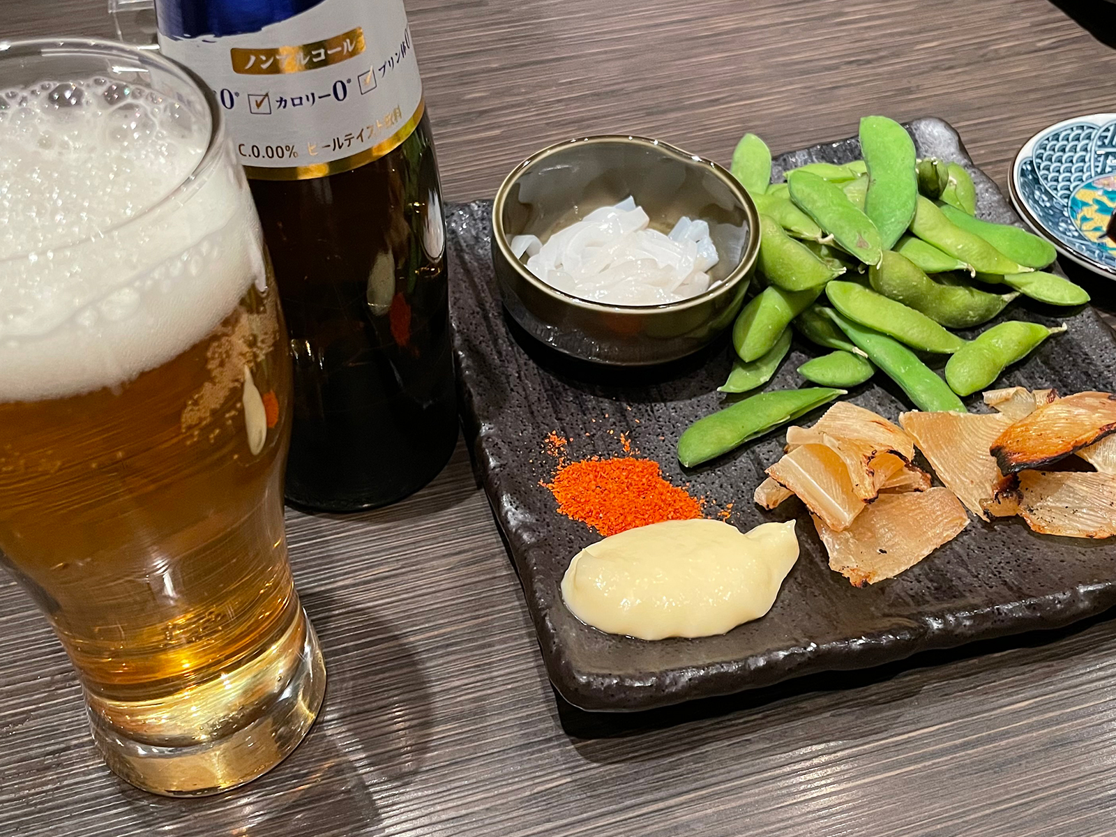 スタートは前菜3種盛り合わせ。この日の盛り合わせは、イカそうめん、枝豆、エイヒレでした。お酒のアテにぴったりの盛り合わせですね!