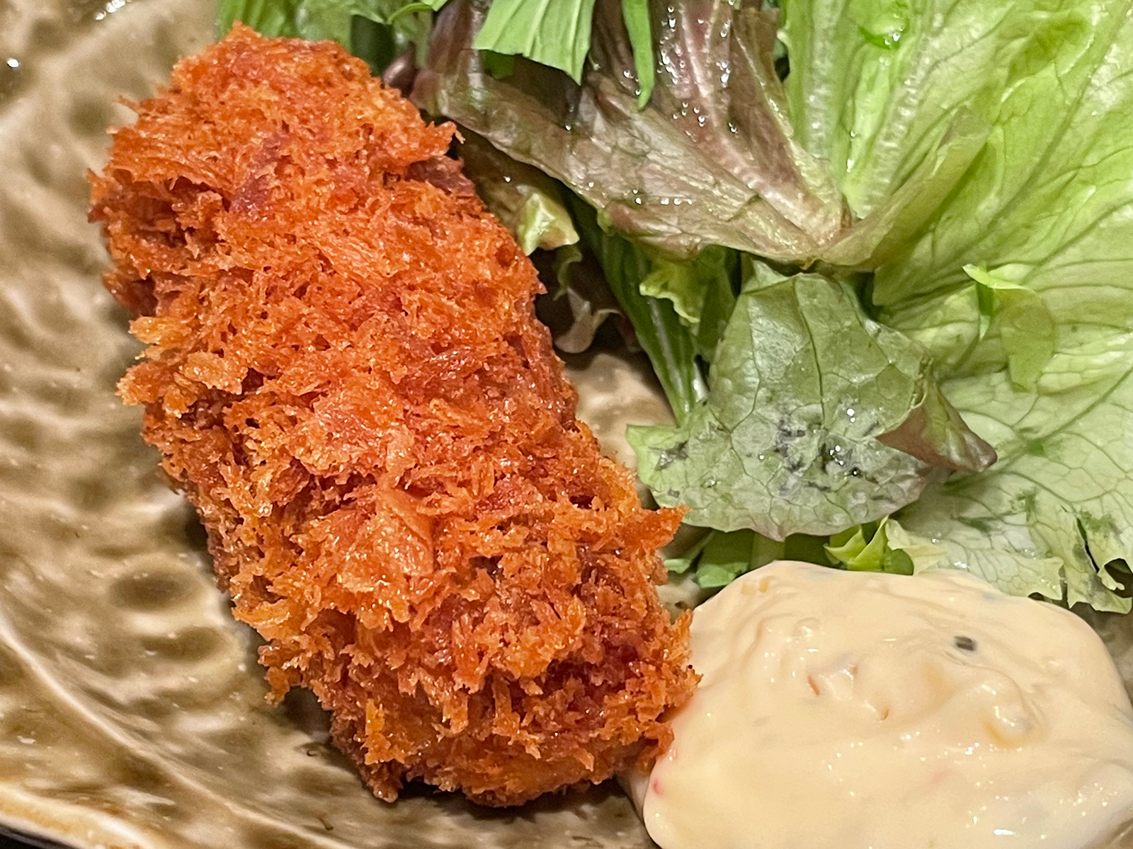衣がサクサクのカキフライ!タルタルソース付きで味わえます。中の牡蠣はプリプリでジューシー!熱々なので火傷に気をつけてください。
