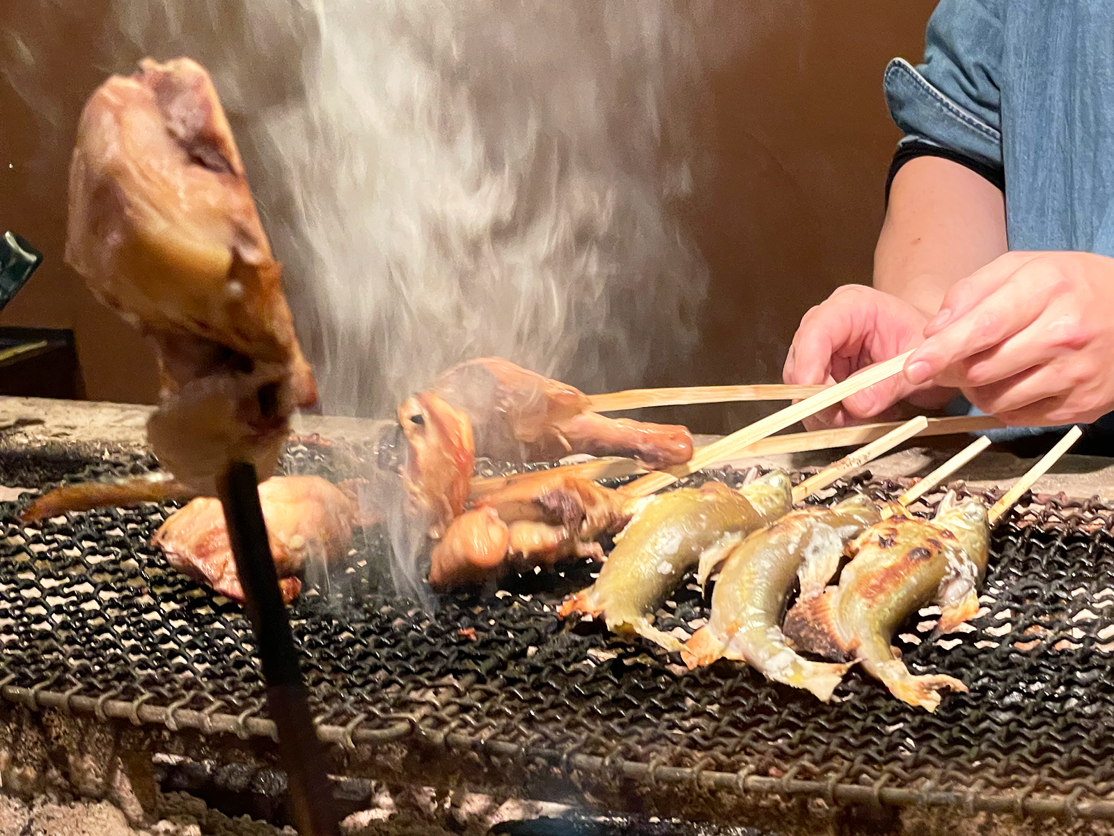 五堪の店内入り口付近には、囲炉裏のような焼き場があり、こちらで海の幸、山の幸を炭火焼きにして頂くことができます。コースに含まれる鮎の原始焼きも、こちらで焼いていました。食材が目の前で焼かれていくライブ感で、お料理もより美味しく感じられそうです。