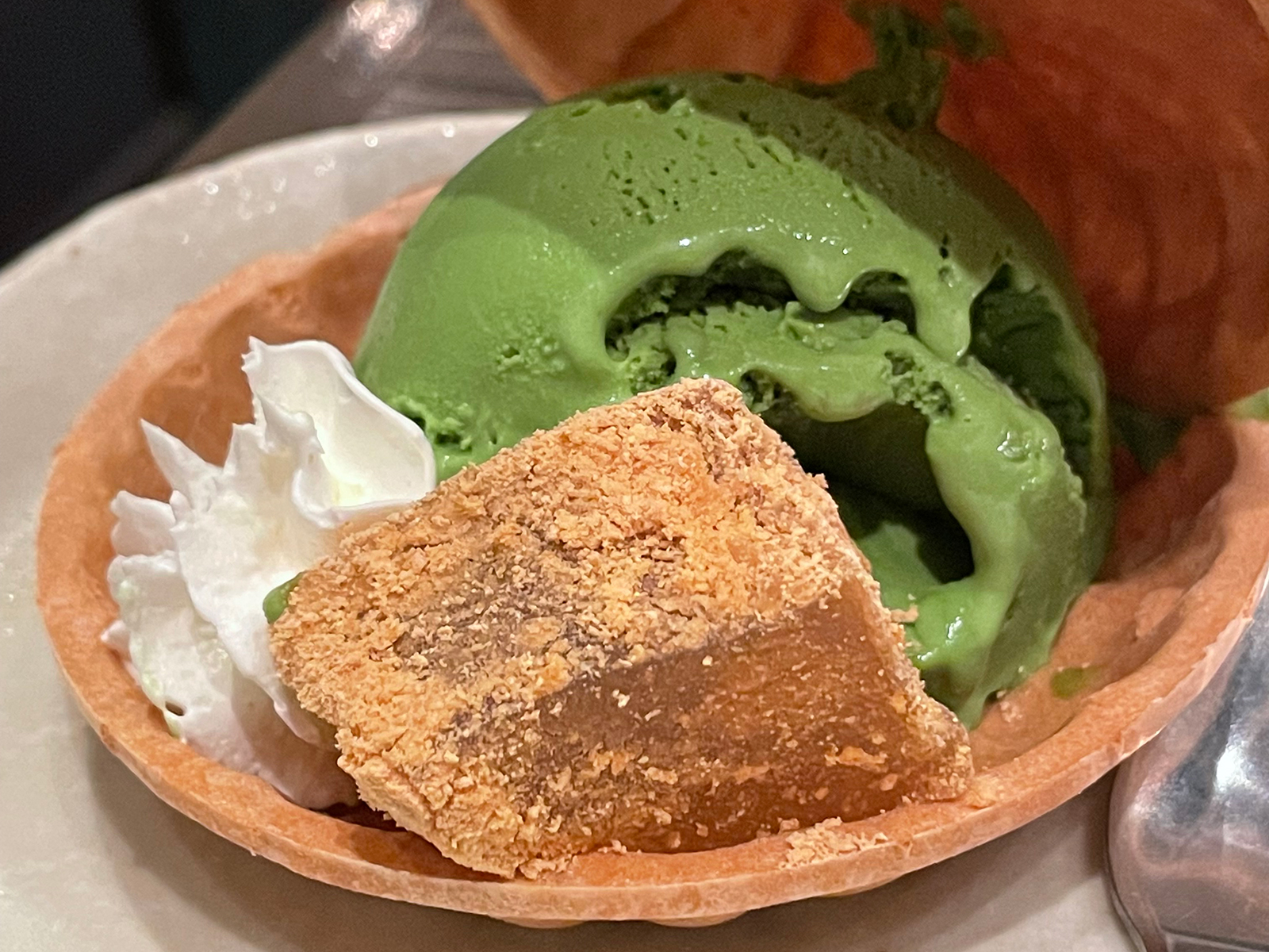 食後はデザートの最中。パリパリの最中に抹茶のアイスクリーム、わらび餅、生クリームが入っています。甘味が〆に最高です!