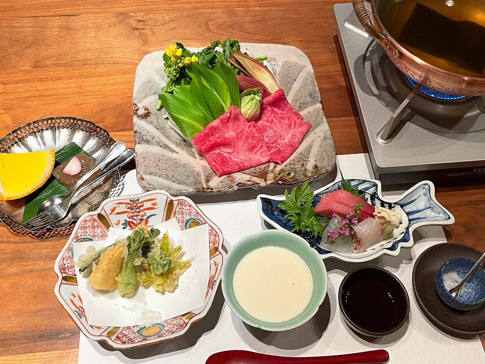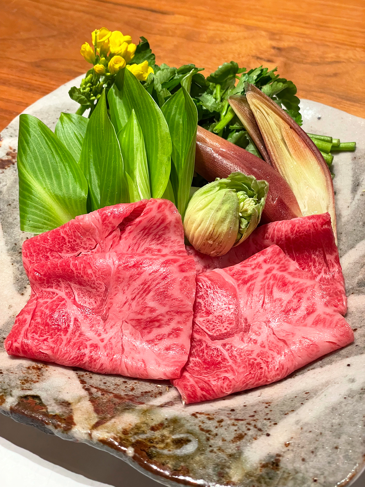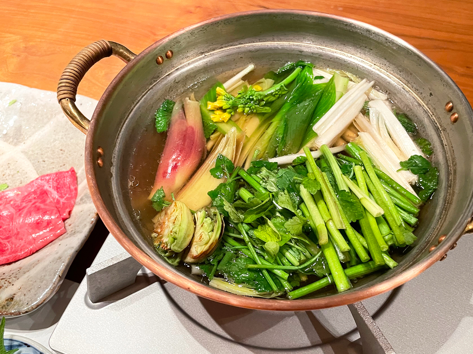 こちらが本日のメインディッシュ!鹿児島産の黒牛の牛しゃぶと春の山菜を使ったにがみ鍋。牛肉は美しいピンク色で、適度に脂が乗った上質なお肉です。こちらを昆布のお出汁が効いた鍋でしゃぶしゃぶしていきます。