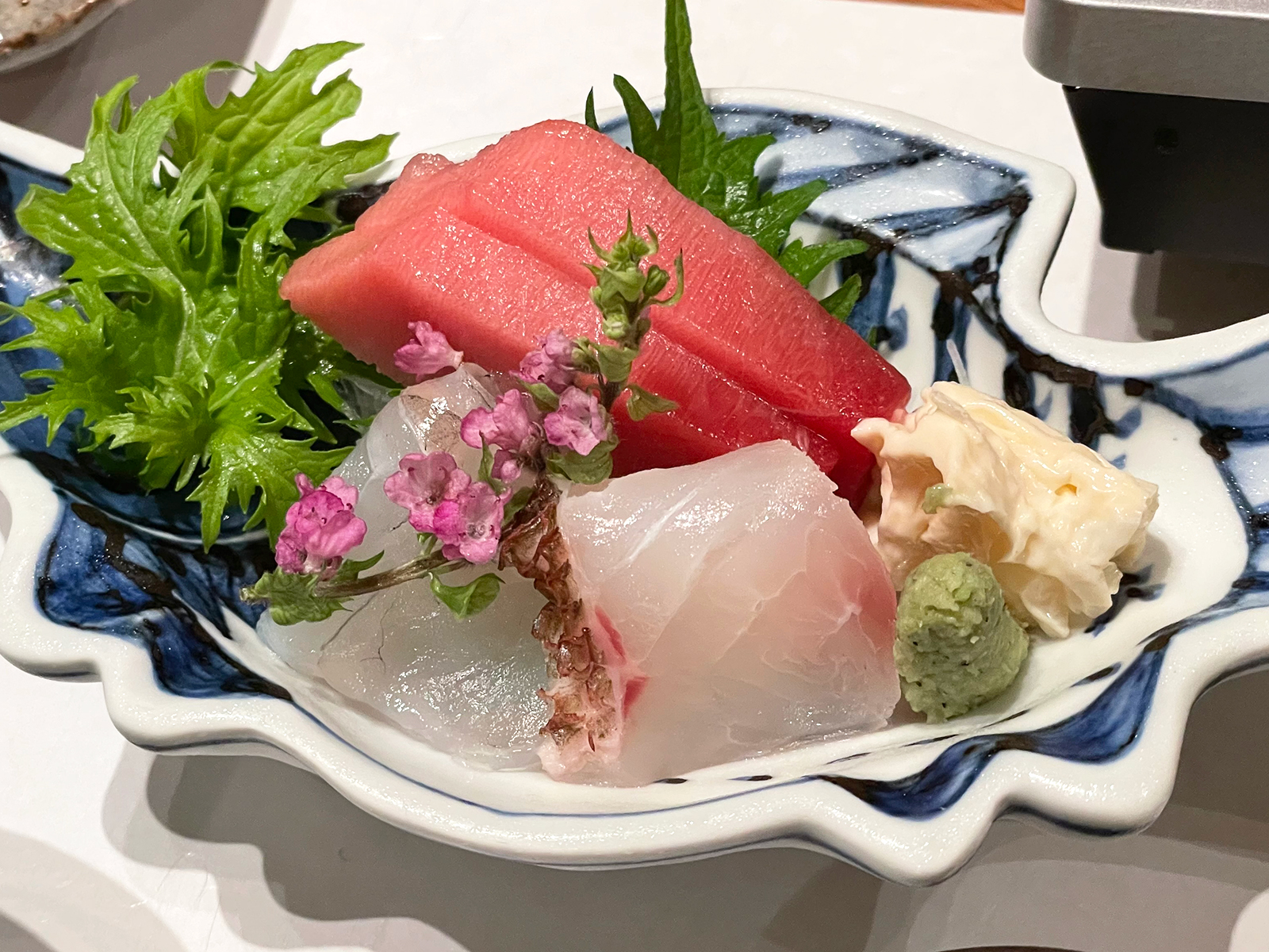 お造りは口当たり滑らかで脂が甘いマグロと、コリコリした歯ごたえの鯛。鮮度抜群で美味しい!脇には湯葉が添えられています。