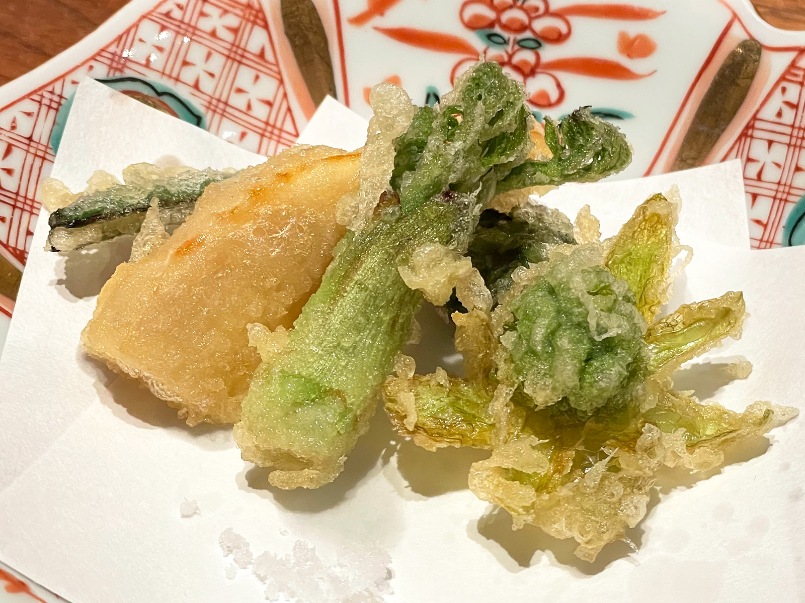 カラッと揚がったサクサクの天ぷらは、シャクシャクした歯ごたえが最高な筍と、ほろ苦い風味が美味しい、タラの芽やふきのとう等の春の山菜が揃っています。旬の食材で、季節感のあるお料理が楽しめるのはいいですね。