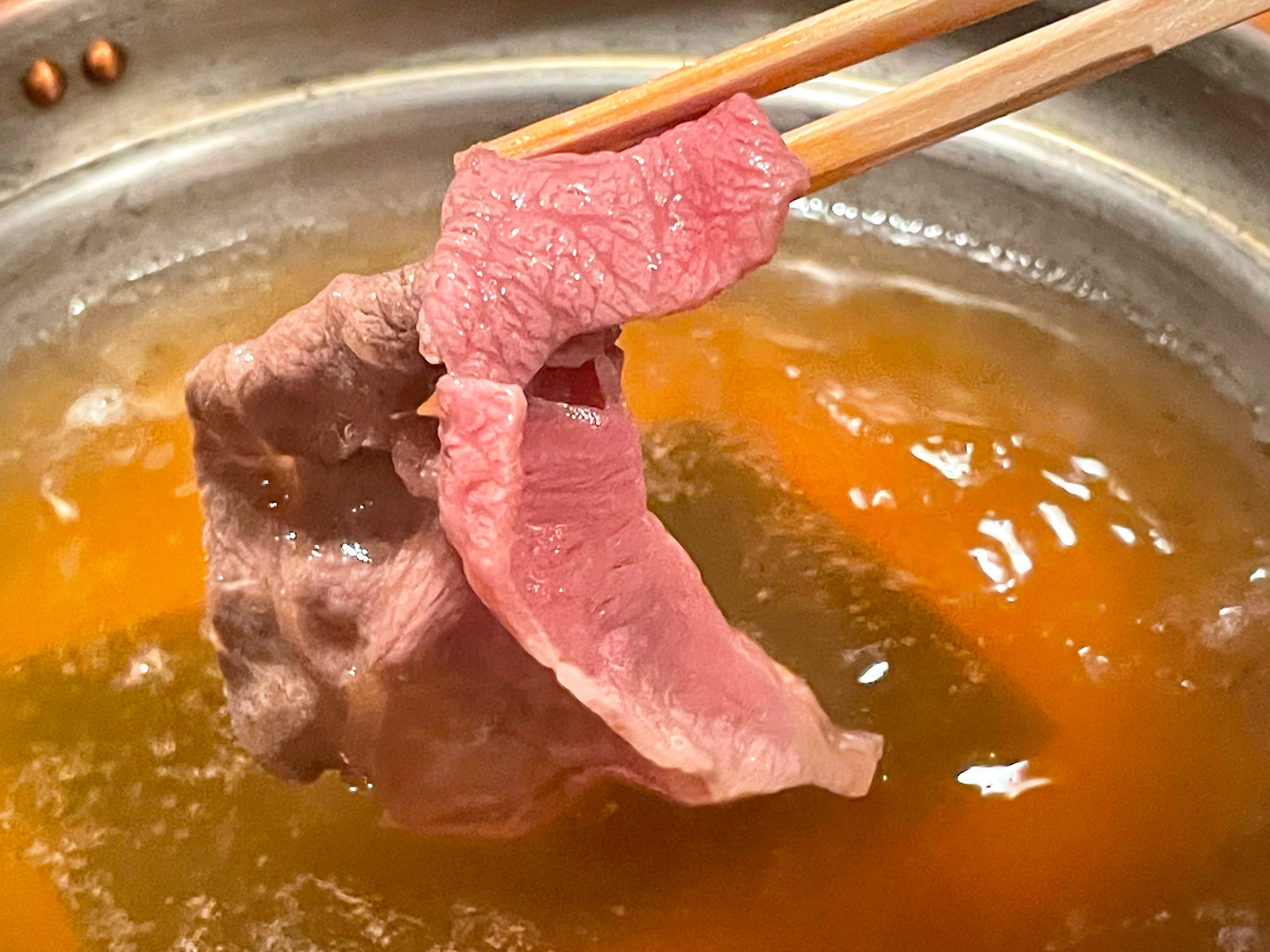 サッとお出汁にくぐらせたお肉。お出汁にはしっかり味が付いているので、そのまま頂きます。とろけるような柔らかさと、上質な脂から出る甘みは至福の一言に尽きます!幸せはここにありました!