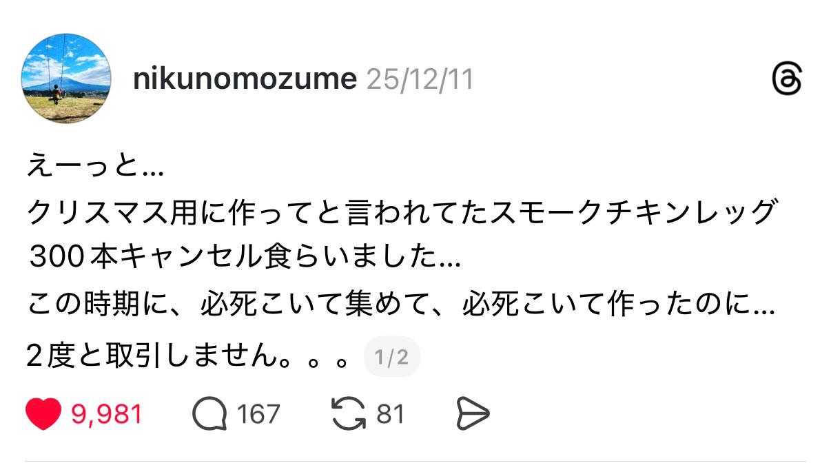 きっかけとなった、こちらのSNSの投稿。肉の卸業を営む「肉のモヅメ」さんが、予約を受けていたクリスマスチキン300本がキャンセルとなってしまったと嘆く物でした。