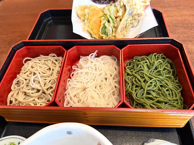 一番右の「茶っきり」は、高級抹茶を練りこんで作られたそばで、まずは一口つゆをつけずにそのまま食べてみてください。抹茶の香りがよりしっかりと感じられます。真ん中の「大御所そば」は、蕎麦の実の中心部分を使用して作られたさらしそばで、しっかりコシがあって上品なそば。そして野生味感じる「せいろ」と、個性豊かな三種盛りを楽しめます。