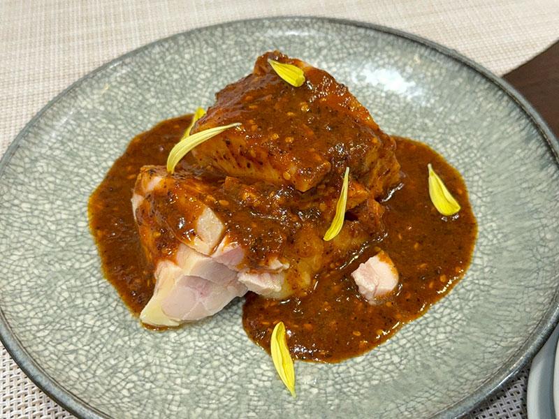 一品目はよだれ鶏にしました!しっとり柔らかい鶏肉に、ちょっとピリ辛なタレがたっぷりかかってます。桃之介さんは調味料から手作りしているということで、このタレもクセになるうまさ!