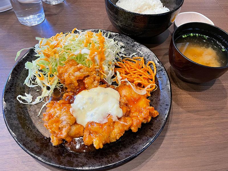 メインのチキン南蛮とキャベツ、スパゲティがワンプレートに。ご飯、味噌汁、漬物が付いて来ます!プリプリジューシーなチキンに、甘ダレとタルタルをまとわせていただきます!この二つのソースが重なり合ったハーモニーで、ご飯が無限に食べられそうです。最高にうまい!