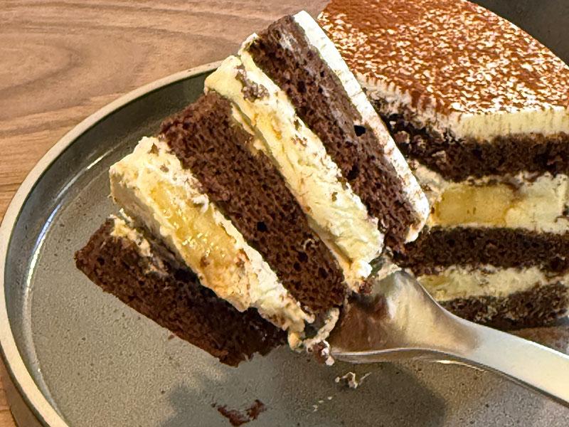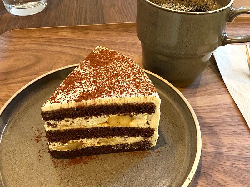 手作りのケーキが美味しいツンドクカフェ。2025年4月の月替りは、チョコのスポンジとクリームが層になった、カラメルバナナショートケーキ。バナナの自然な甘さとクリームの相性が最高。カラメルのほろ苦さが良いアクセントになってます。甘すぎず、軽い口当たりで、あっという間にぺろりです!美味しい!