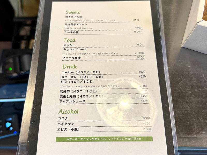 プレートメニューに、ケーキ、ドリンク、個包装された焼き菓子も店内で食べることができるそうです。